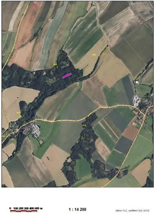 Spoluvlastnický podíl 1/12 k lesnímu pozemku. Lesní porost se zastoupením SM 90, JIV 5, OL5,, věk 43 let, zakmenění 9. Na části pozemku je holina (rozloha 2 000 m2).