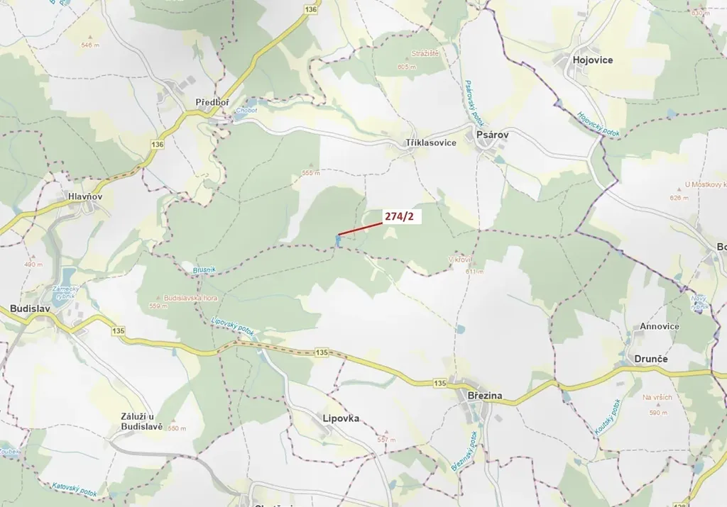Lesní pozemek o výměře 5 348 m2, parcelní číslo 274/2, podíl 1/1, katastrální území Tříklasovice, obec Psárov, obec s rozšířenou působností Tábor, okres Tábor, Jihočeský kraj. Částečně po těžbě.