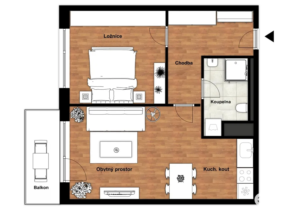 - Balkon: 5,13 m² (ve výhradním užívání majitele bytu, přístupný z obývacího prostoru),