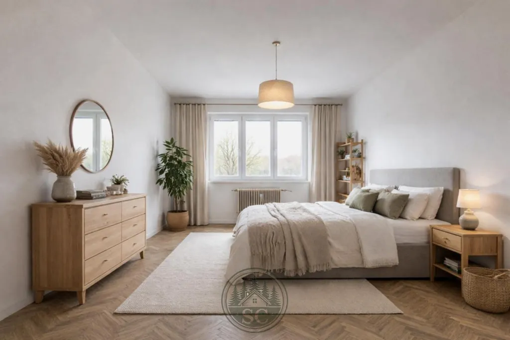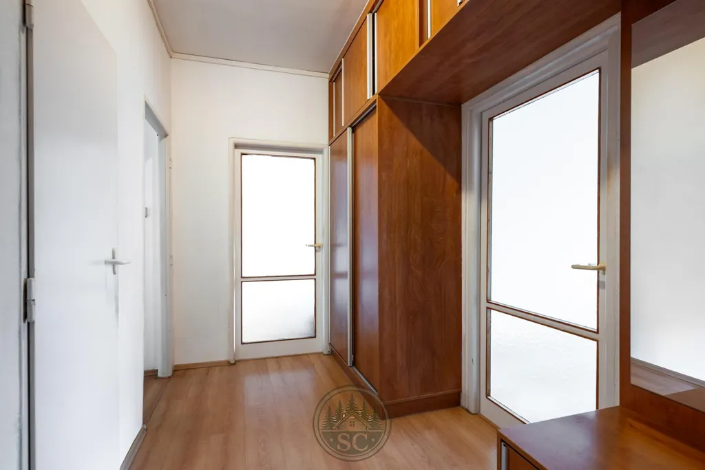 V předsíni se nachází vestavná skříň vyrobená na míru, rovněž z dílny místního truhláře. Je navržena s důrazem na maximální využití prostoru a její součástí je garderobní část s věšákovou stěnou na bundy a botníkem, která zajišťuje přehledné a funkční řešení vstupu do bytu.