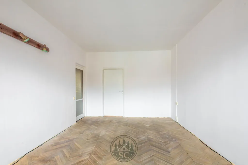 Byt se prodává nezařízený. Součástí inzerce jsou dvě vizualizace možného budoucího stavu bytu (nezobrazují skutečný stav).