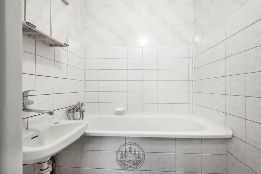Koupelna je vybavena vanou a umyvadlem, WC je oddělené.