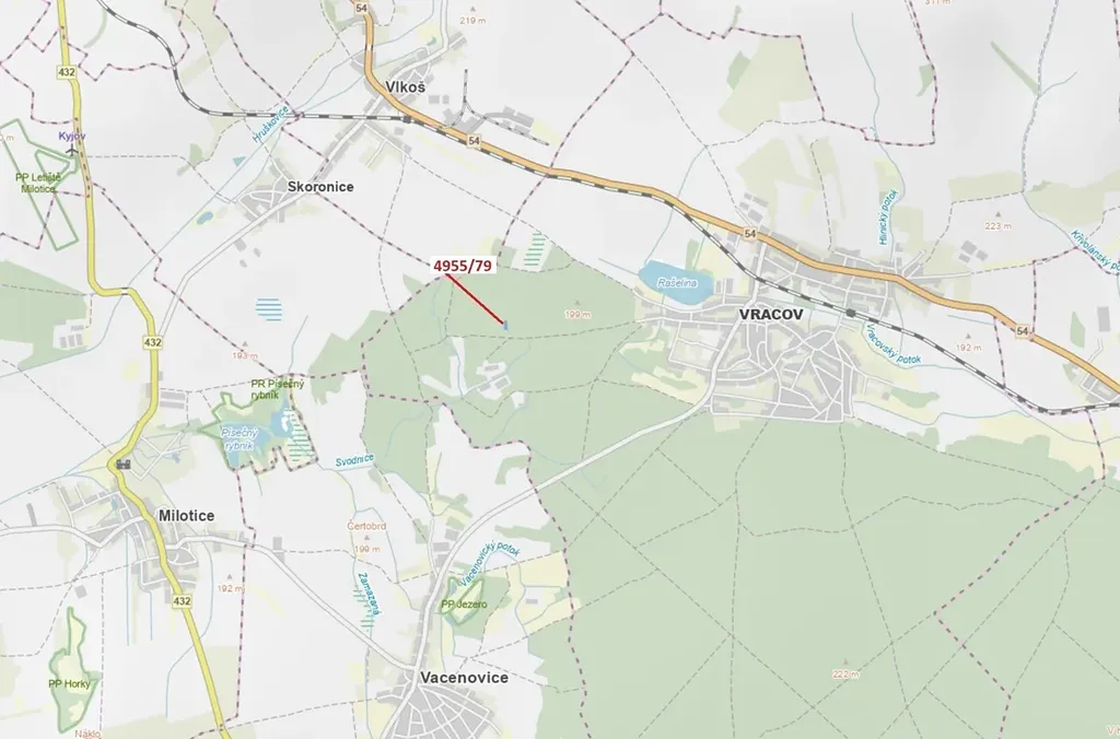 Lesní pozemek o výměře 1662 m2, parcelní číslo 4955/79, podíl 1/1, katastrální území Vracov, obec Vracov, obec s rozšířenou působností Kyjov, okres Hodonín, Jihomoravský kraj. Po těžbě.
