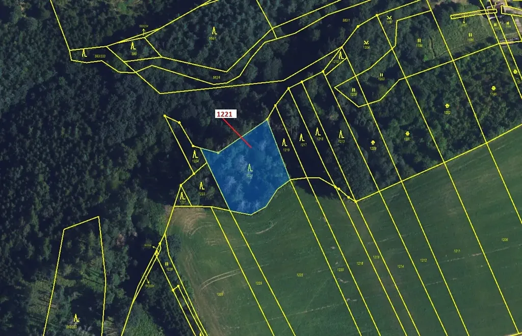Lesní pozemek o výměře 1590 m2, parcelní číslo 1221, podíl 1/1, katastrální území Spešov, obec Spešov, obec s rozšířenou působností Blansko, okres Blansko, Jihomoravský kraj. Po těžbě.