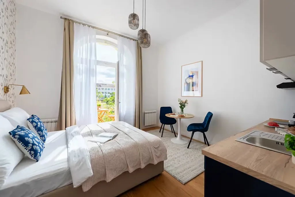 Pět minut od domu se nachází náměstí Jiřího z Poděbrad, známé svými farmářskými trhy a bohatou nabídkou kaváren a restaurací světových kuchyní. V blízkosti domu se nachází také krásné parky, jako jsou sady Bratří Čapků, sady Svatopluka Čecha či Bezručovy sady, ideální pro relaxaci nebo sportovní aktivity. Byt je kompletně zařízený, včetně kuchyňské linky s vestavěnými spotřebiči a dostatkem úložného prostoru.