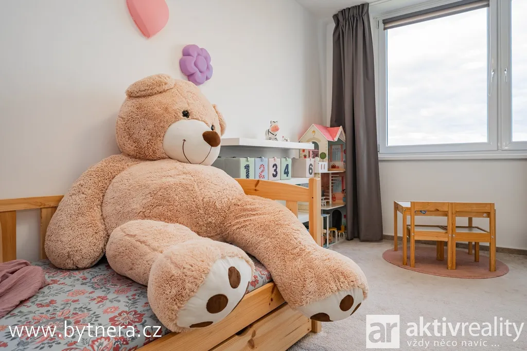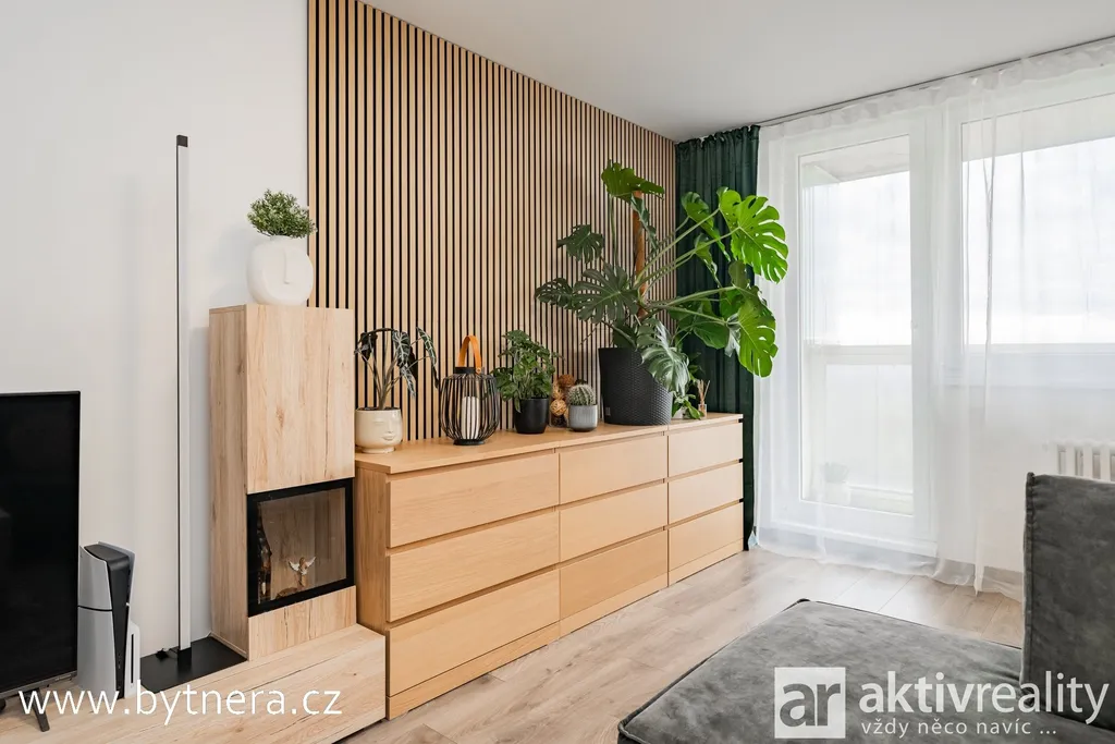 Disponuje světlým obývacím pokojem s jídelním koutem a vstupem na zasklenou lodžii. Kuchyně je vybavena novou moderní kuchyňskou linkou se zabudovanými spotřebiči a nabízí dvě praktické špajzy. K dispozici jsou dále dva samostatné pokoje – ložnice a dětský pokoj – s příjemným výhledem do okolí. Prostorná moderní koupelna je vybavena vanou a přípojkou na pračku, přičemž zde zůstal dostatek místa i pro sušičku.