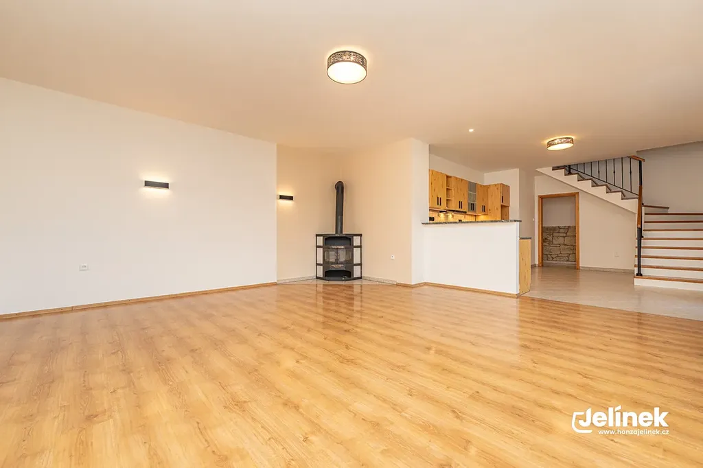 V přízemí se nachází velkorysý obývací prostor s krbem, který je přirozeně propojený s kuchyní. Tento prostor tvoří srdce celého bytu a nabízí dostatek místa jak pro rodinný život, tak pro posezení s přáteli.