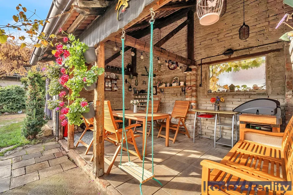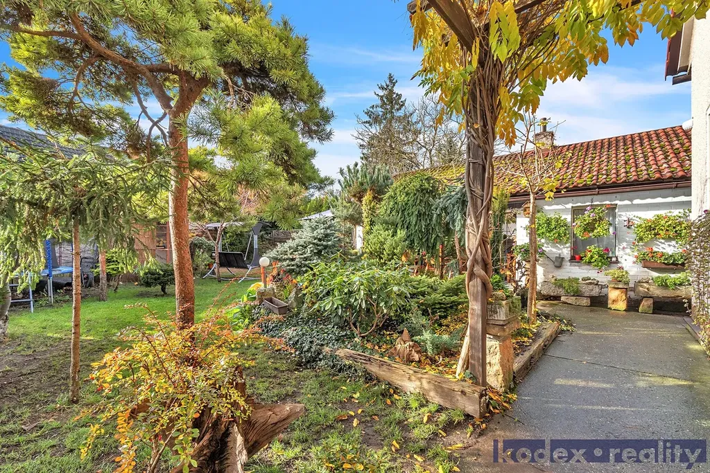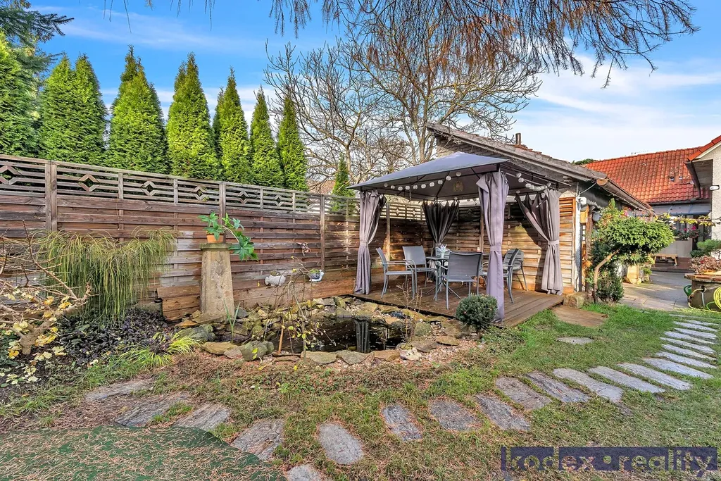 Parkování - garáž a v ulici před domem. Zahrada s jezírkem, dvě terasy, venkovní sklad a studna s užitkovou vodou.