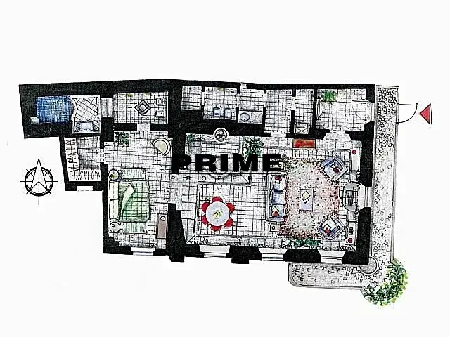 Přístup do bytu je přes privátní zahrádku a z bytu je výhled na společný dvůr se zelení a fontánou. V bytě jsou gotické klenby. Dispozice bytu: vstupní hala, obývací pokoj (47m2) s jídelní částí a plně vybaveným kuchyňským koutem (sklokeramická varná deska, mikrovlnná trouba, lednice, mrazák a myčka), ložnice (17m2) se šatnou a dvouúrovňovou koupelnou (s velkou zapuštěnou vanou, umyvadlem, toaletou a bidetem), druhá koupelna (velký sprchový kout, umyvadlo, toaleta a bidet) a komora.