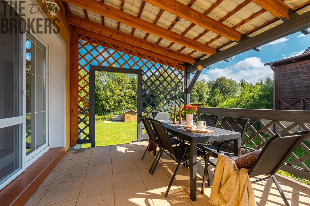 Při vstupu do domu vás přivítá útulná vstupní místnost, která navazuje na chodbu. Odtud se otevírá srdce celé domácnosti – prostorný obývací pokoj propojený s kuchyní s novými spotřebiči. Je to místo, kde se potkává rodina, kde se tvoří vzpomínky a kde vás denně zahřeje nejen teplo domova, ale i atmosféra tohoto prostoru. Z obývacího pokoje se přímo vychází na krytou terasu o velikosti 15 m², která poskytuje nádherný výhled do zahrady a stává se přirozeným prodloužením obytného prostoru. Terasa je ideálním místem pro letní snídaně, večerní posezení s přáteli či chvíle klidu s knihou v ruce.