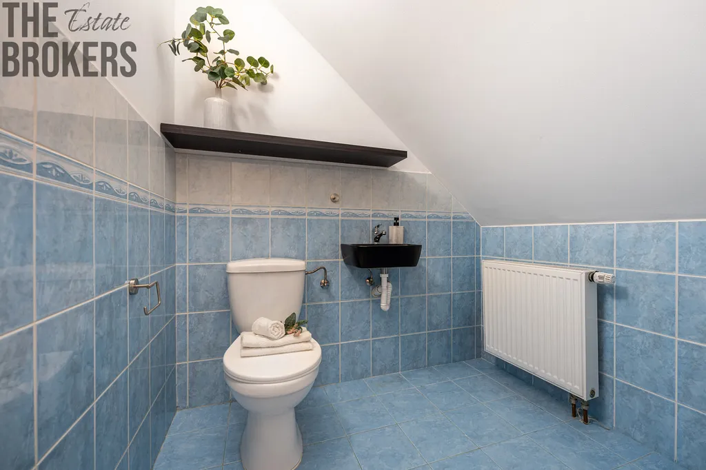 V přízemí se dále nachází technická místnost a koupelna s toaletou, což zajišťuje praktické zázemí pro každodenní život. Po dřevěných schodech vystoupáte do podkroví, kde je ložnice a dva samostatné pokoje, ideální jako dětské pokojíčky či pracovny. V podkroví nechybí ani druhá toaleta. Půdní prostor pak nabízí dostatek místa pro uskladnění sezónních věcí a může sloužit i k dalšímu využití.