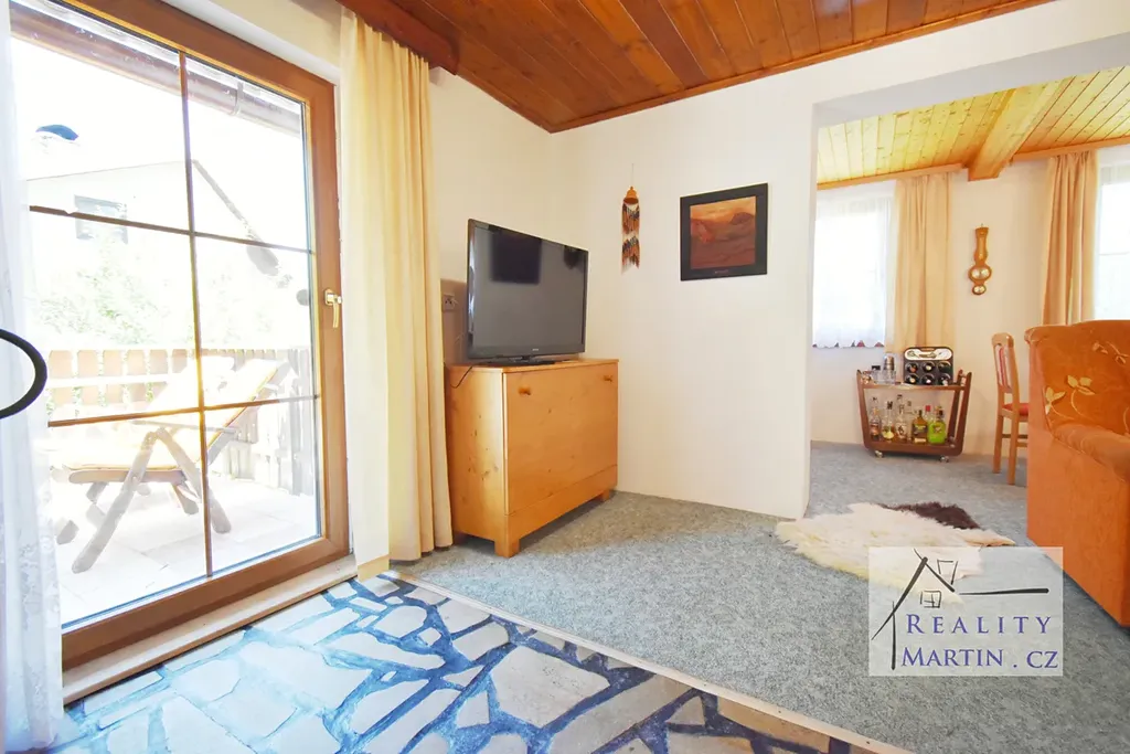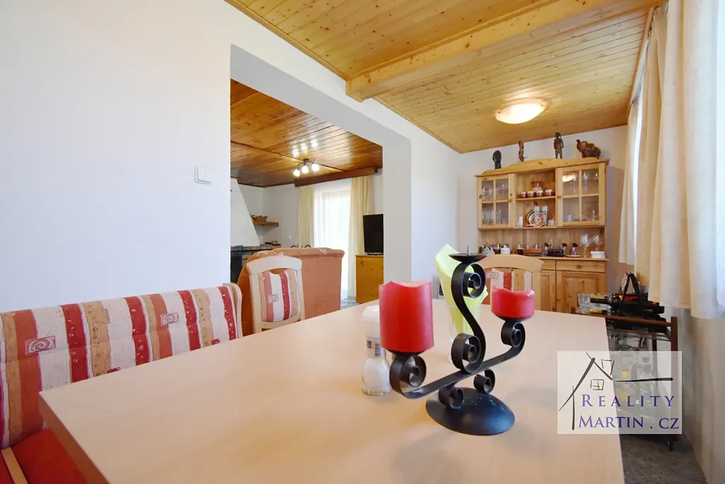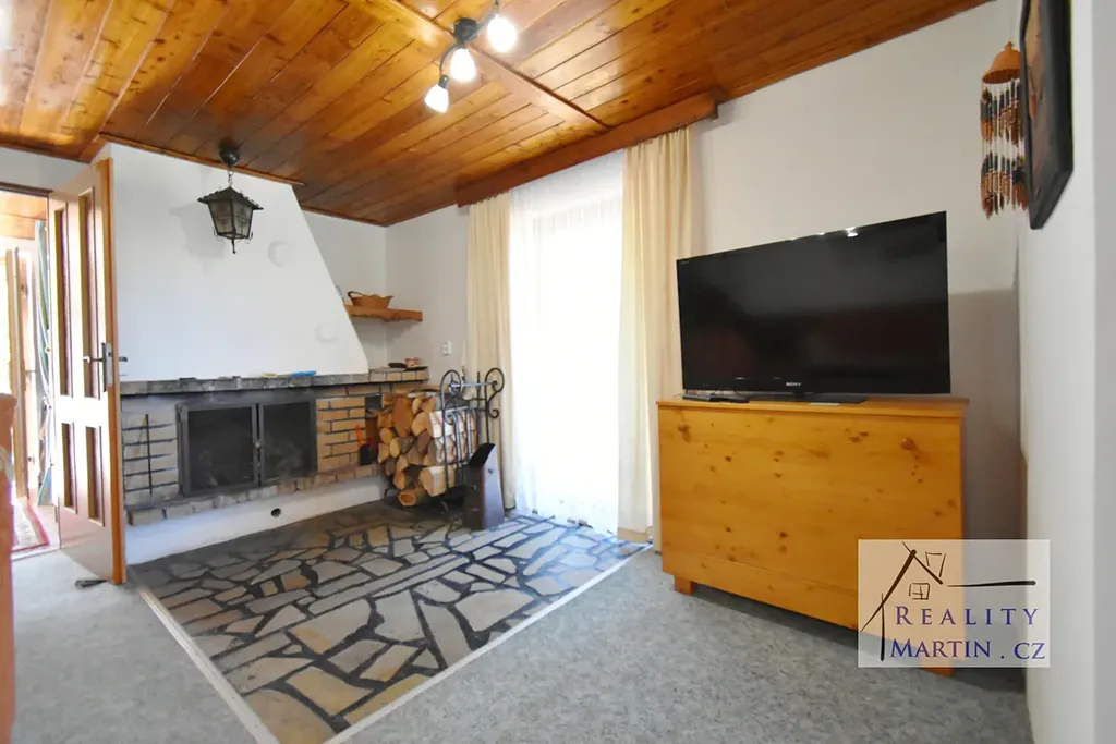• V přízemí se nachází obývací pokoj s krbem, kuchyně s jídelním koutem a koupelna s WC.