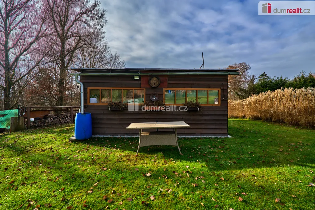 Součástí pozemku je již umístěný moderní modulární domek, který umožňuje okamžité a pohodlné bydlení nebo může sloužit jako zázemí během budoucí výstavby. Domek disponuje kuchyní, světlou prosklenou jídelnou a ložnicí, čímž nabízí příjemné a funkční řešení pro každodenní život. Vedle domku je k dispozi venkovní sprcha a suchá toaleta. Na pozemek je přivedena voda z místní vodovodní přípojky a k dispozici je také elektrická přípojka. Vedle domku se nachází praktická dřevěná kůlna vhodná pro uskladnění zahradního nářadí či dalšího vybavení.