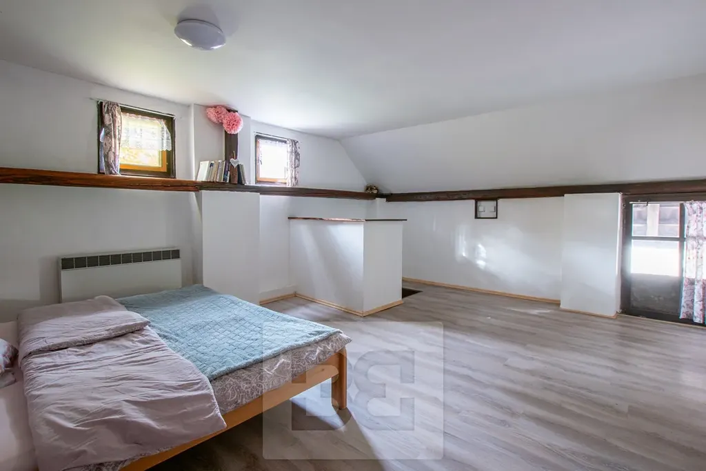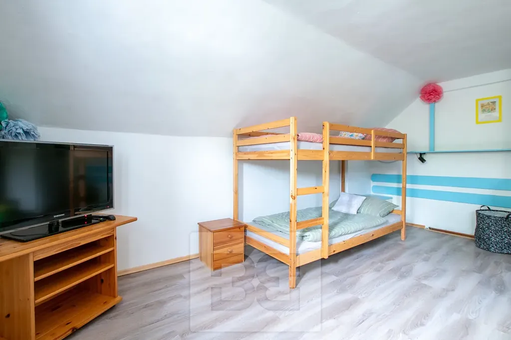 V patře domu jsou dvě prostorné a světlé ložnice, přičemž jedna z nich může sloužit jako dětský pokoj.