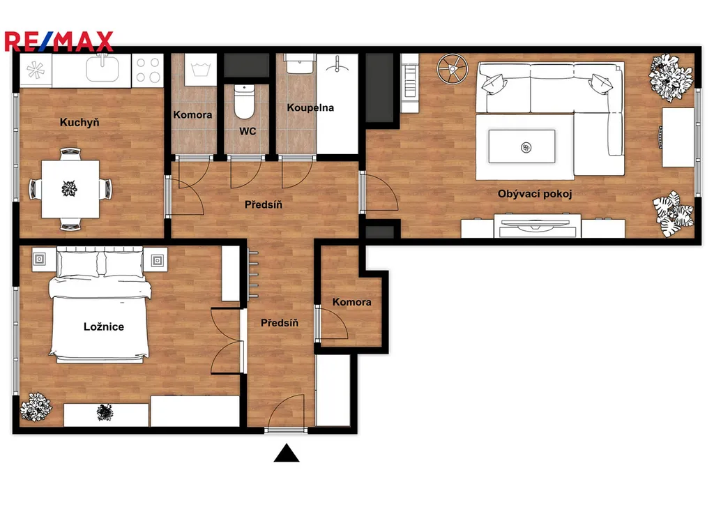 Byt se skládá z obývacího pokoje, ložnice, kuchyně, koupelny s vanou a samostatné toalety. Pro dostatek úložného prostoru jsou k dispozici 2 komory - v 1 komoře je napojena pračka, ve 2. komoře jsou police a v předsíni velká vestavěná skříň, což usnadňuje organizaci domácnosti. Kuchyňská linka je vybavena elektrickým sporákem a lednicí. Interiér bytu je čistě vymalovaný a podlahy v obytných místnostech jsou pokryty novým PVC. Byt není zařízen nábytkem.