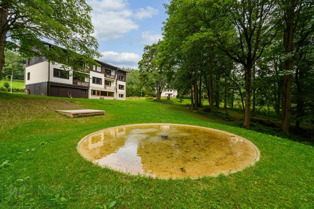 U domu se nachází lesopark s posezením u okrasného jezírka s fontánou, o kousek dál protéká potůček, jedná se o perfektní místo pro odpočinek.
