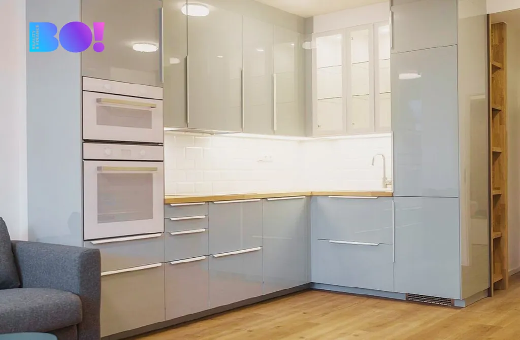 Obývací pokoj je prostorný a propojený s moderní kuchyňskou linkou, která je vybavena kvalitními spotřebiči včetně indukčního sporáku, digestoře a nad sebou umístěnými troubami. Důležitým prvkem bytu je dostatek úložného prostoru, který zajišťují nové vestavby v předsíni i obývacím prostoru.