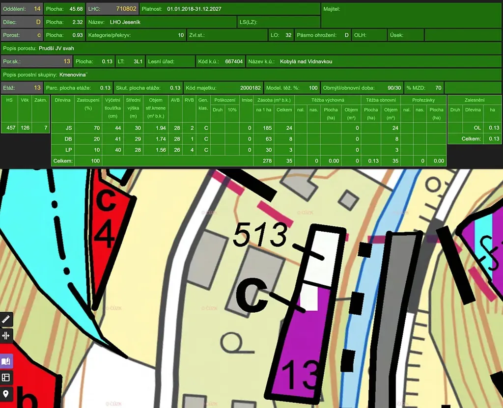 Porost: věk 131 let, 70% jasan, 20% dub, 10% lípa, zásoba v roce 2018 35m3