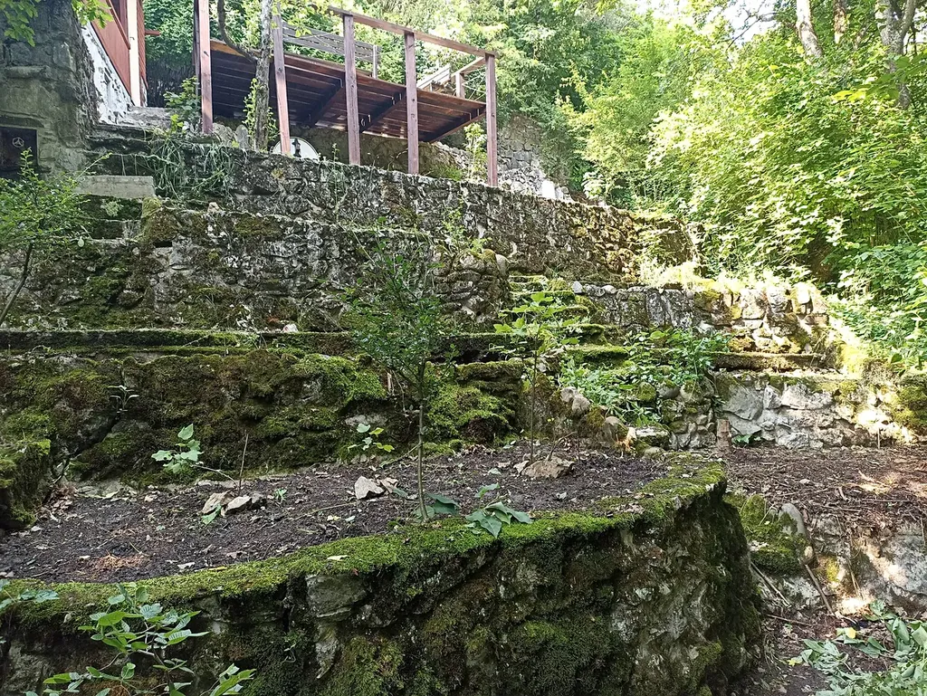 Pozemek kolem chaty, přibližně 150 m², je ve vlastnictví státu, ale využíván majitelem. Terasovitý svah je upraven do úhledných záhonů lemovaných kamenem, což dodává pozemku estetický ráz.