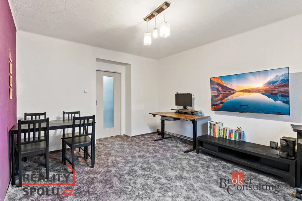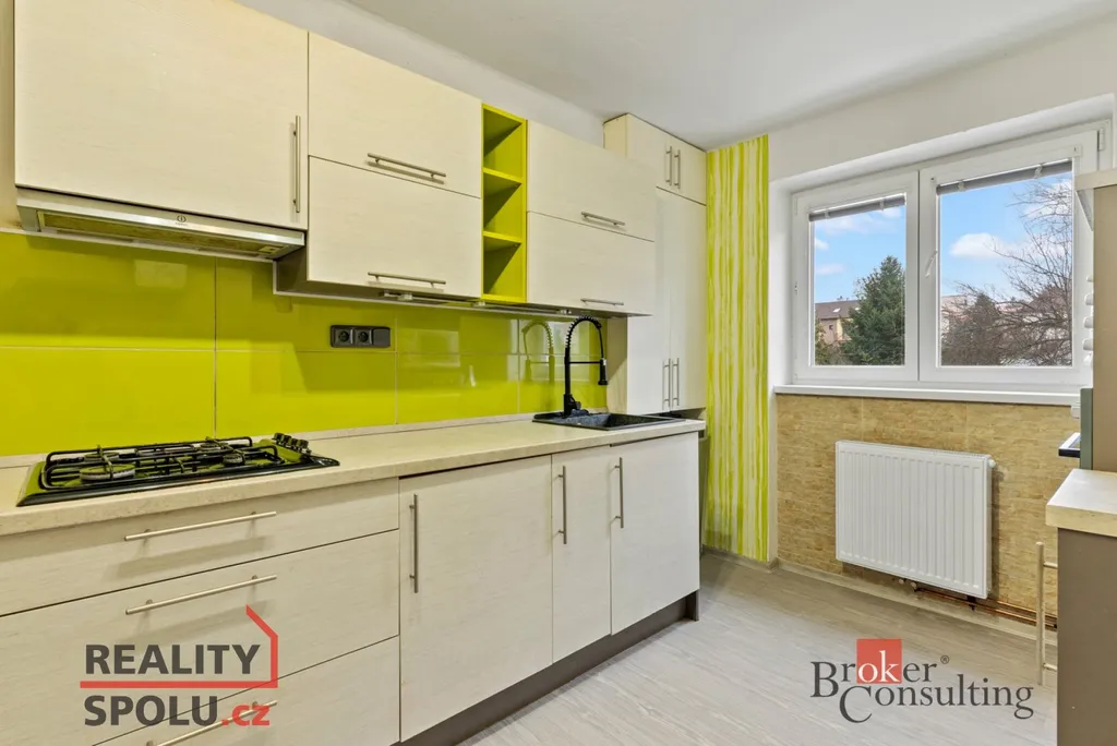Byt má prakticky řešený vstupní prostor, který plynule propojuje obytnou část. Kuchyň je vkusně řešena v kombinaci bílé kuchyňské linky a jemných zelených tónů, které prostoru dodávají svěží a příjemnou atmosféru. Na kuchyň navazuje prostorný obývací pokoj s dostatkem místa pro jídelní stůl, ideální pro rodinné stolování i posezení s přáteli. Dále se v bytě nachází ložnice a koupelna spojená s WC. Byt působí světlým, čistým a útulným dojmem. K bytu náleží také sklep o velikosti 5 m², který poskytuje dostatek úložného prostoru.
