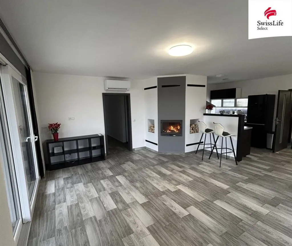 Dům disponuje dvěma koupelnami, přičemž jedna je přímo součástí pokoje, což zajišťuje maximální komfort a soukromí. Prostorný obývací pokoj s terasou a krbem je to co člověk potřebuje.