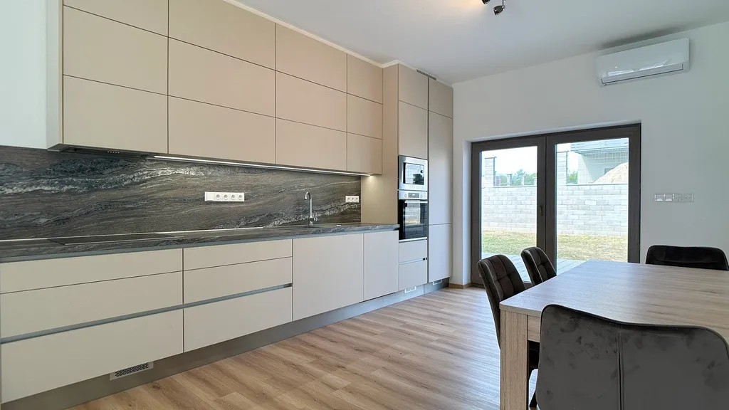 Dispozice: 4+kk Podlahová plocha: 210 m² Zahrada: 260 m² Garáž pro jedno auto + parkovací místo před domem. Dvě koupelny. Kooperativa vody: užitková voda v nádrži na dešťovou vodu slouží k splachování WC a zalévání zahrady. Podlahové vytápění s vlastním tepelným čerpadlem. Samostatná klimatizace ve všech pokojích. Dům je kompletně vybavený, kromě postelí v ložnicích, které si klient musí pořídit sám.