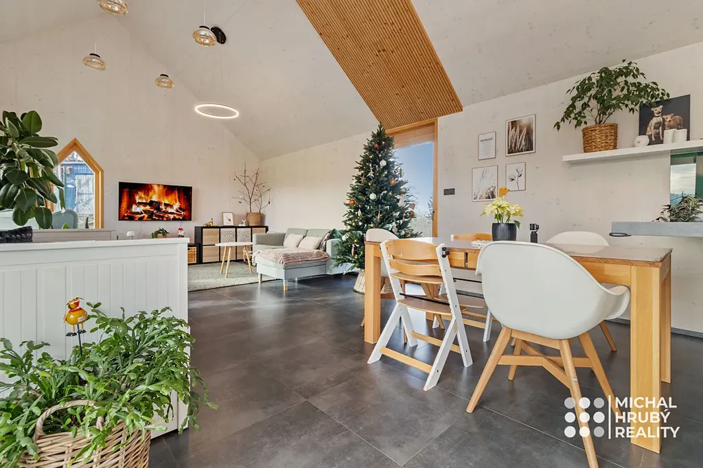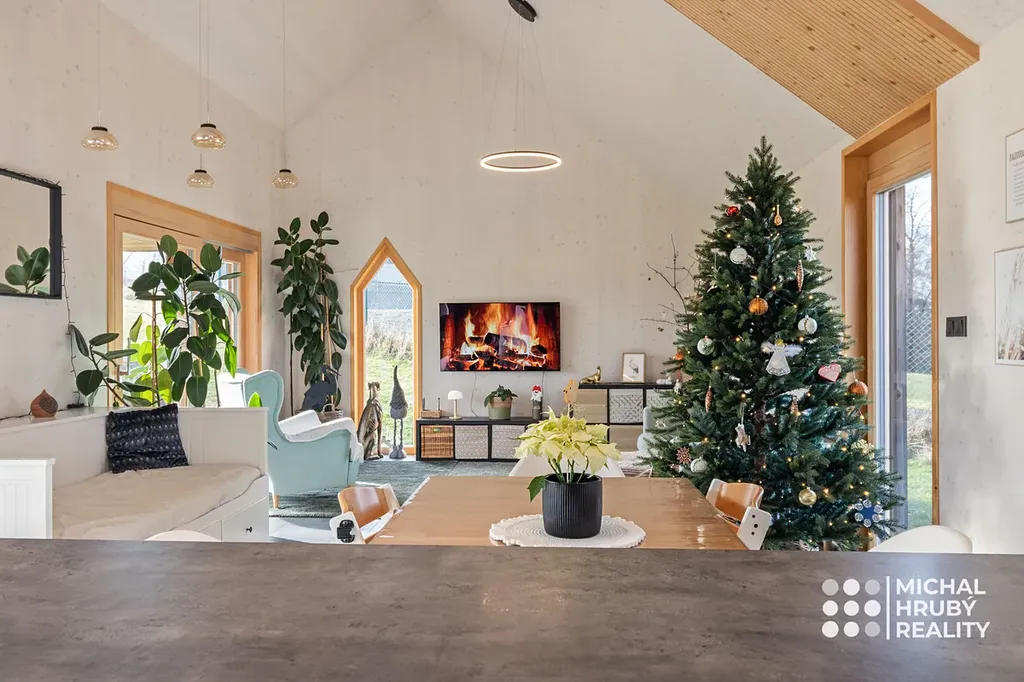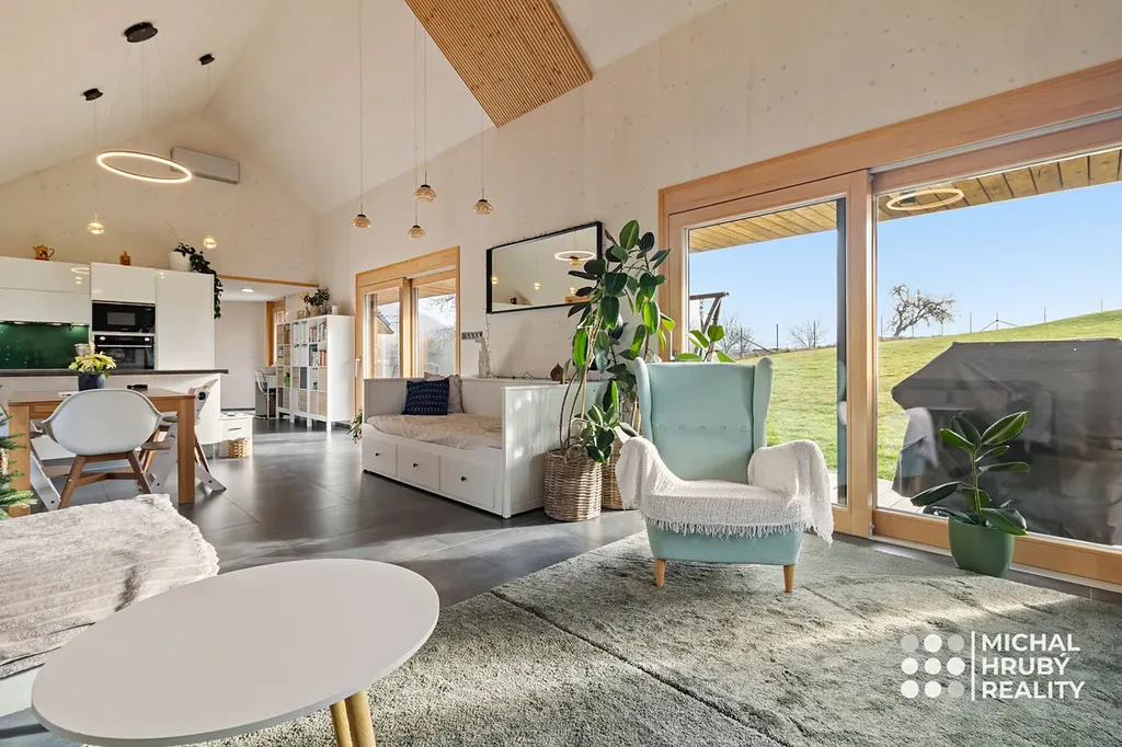 Dům je „zalomen“ a tvoří tak dvě funkční části. Tou hlavní je obývací pokoj s kuchyní (44 m2), kde je díky dvěma HS portálům a dostatku oken dostatek světla a výhled na okolní hory. Kombinace dřeva, použitých barev i materiálů přesně odráží harmonii skandinávských staveb.