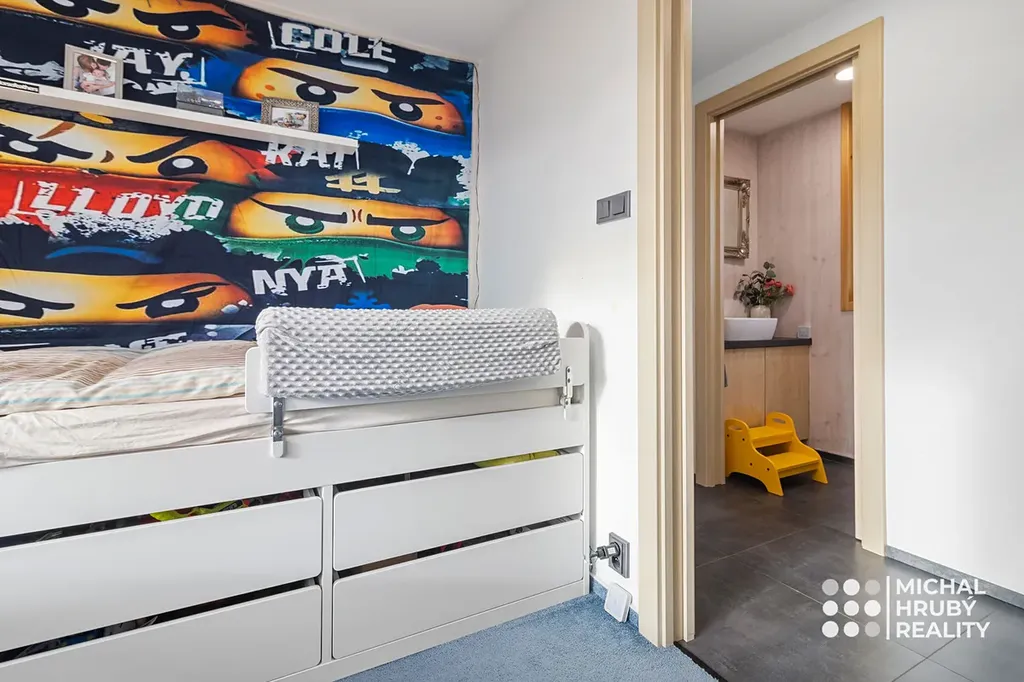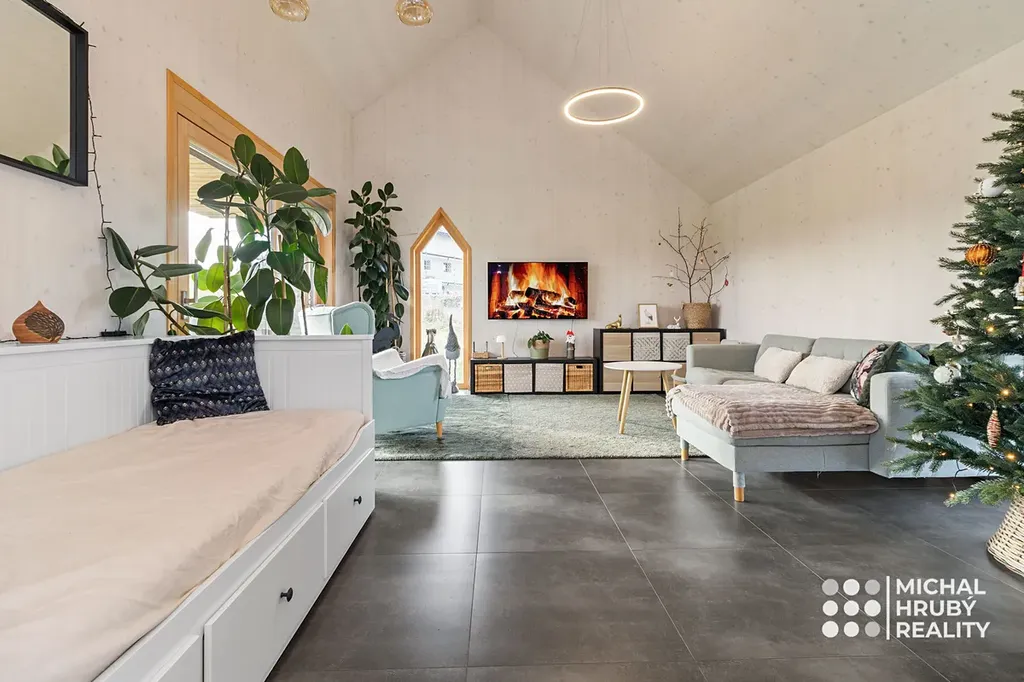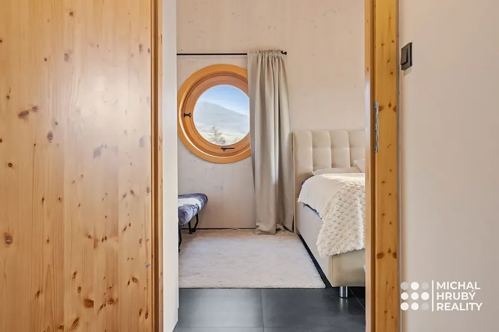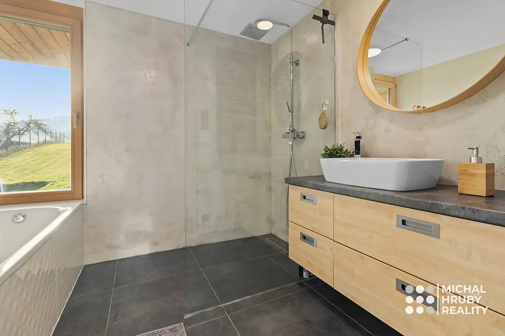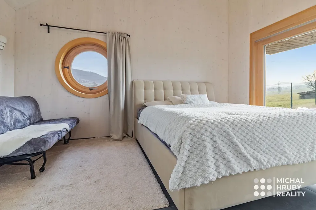 Druhou část tvoří dva dětské pokoje (každý cca 8 m2), koupelna s vanou i sprchovým koutem, technická místnost, šatna integrovaná do chody a světlá ložnice (14 m2). Ze všech pokojů je naprosto fantastický výhled na okolní krajinu a vstup na prostornou terasu (52 m2). Bez ní má dům čistou plochu 115 m2.