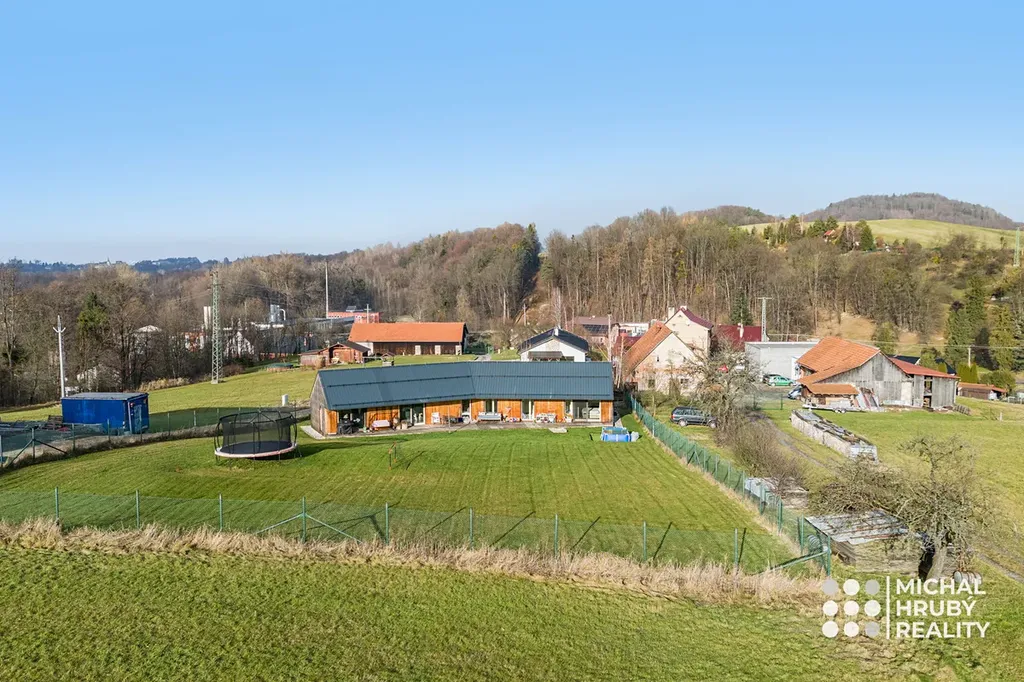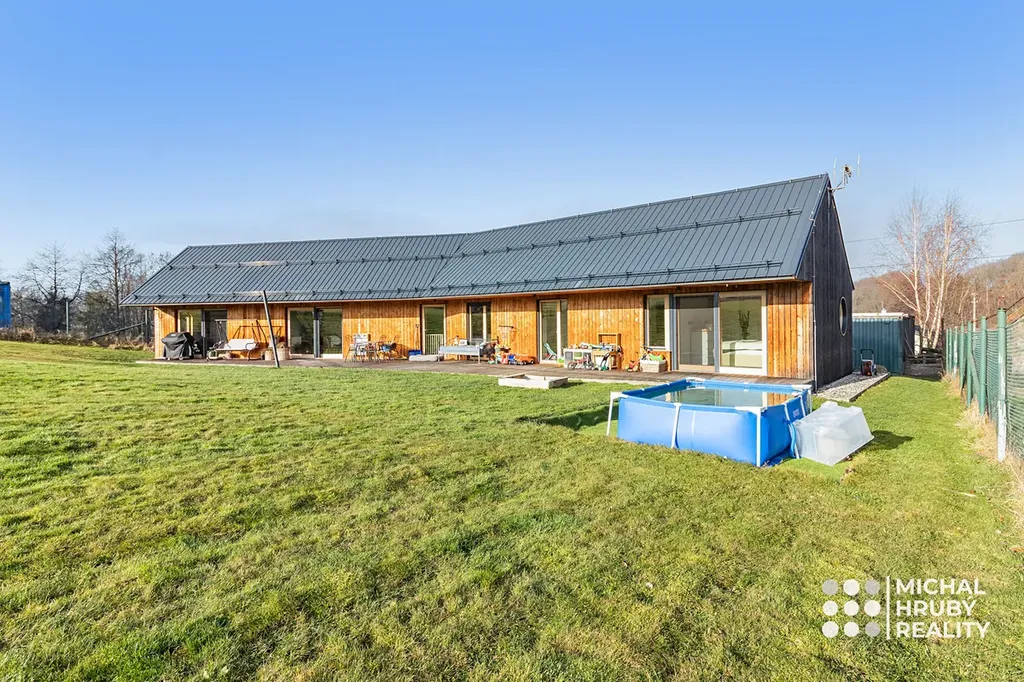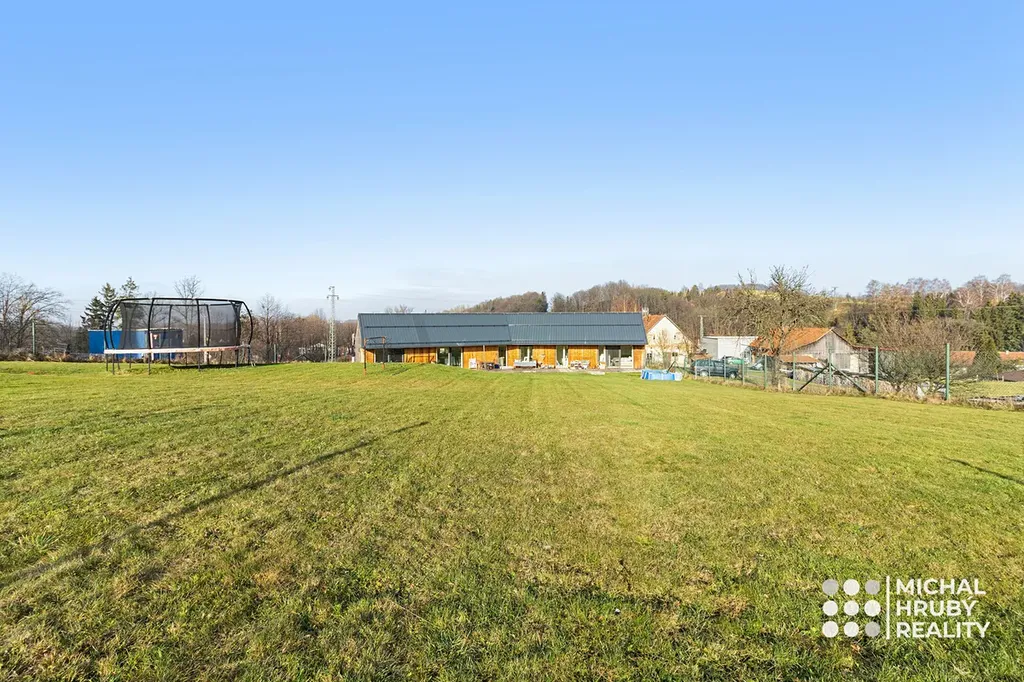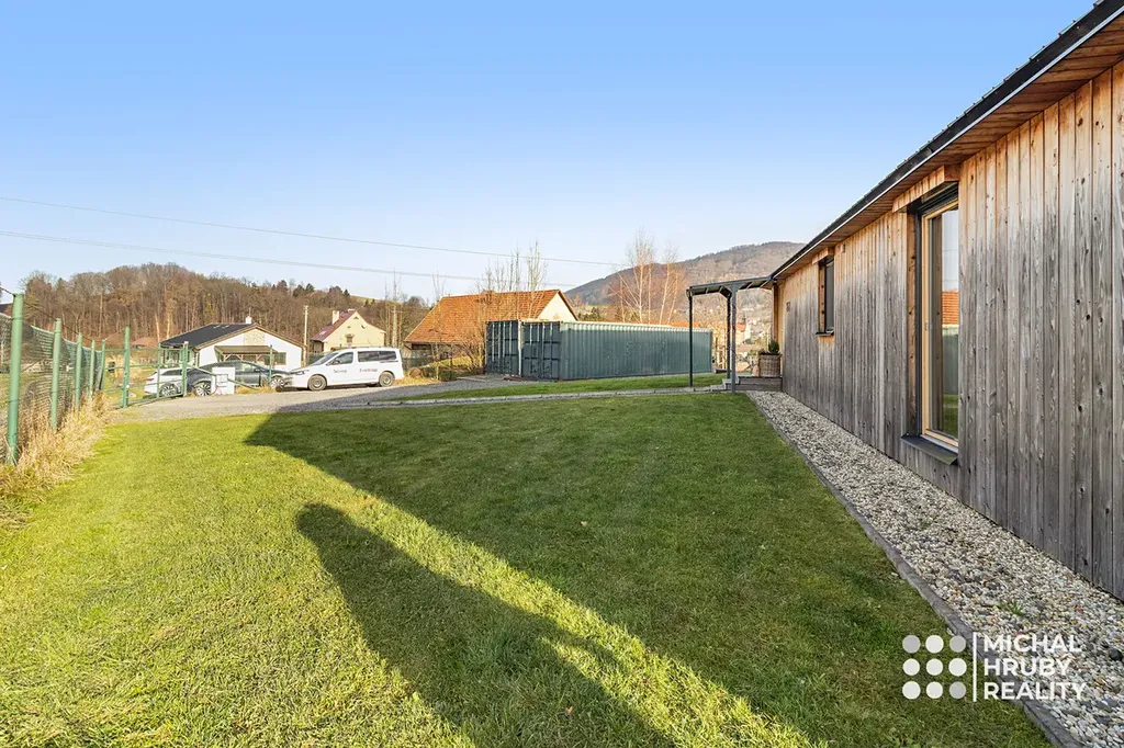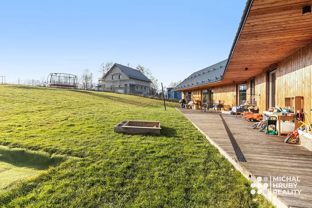 Pozemek kolem domu má 2.333 m2. V přední části jsou umístěny lodní kontejnery, ze kterých je možné udělat garáž nebo dílnu. Zadní část slouží jako zahrada, horní část je rovná, směrem k domu mírný svah. Majitelé mají k dispozici návrh na úpravu zahrady od architekta, kterou můžete využít. Velkou výhodou je, že nad pozemkem už se nedá stavět, takže vám nikdo nebude bránit ve výhledu okolní kopce.