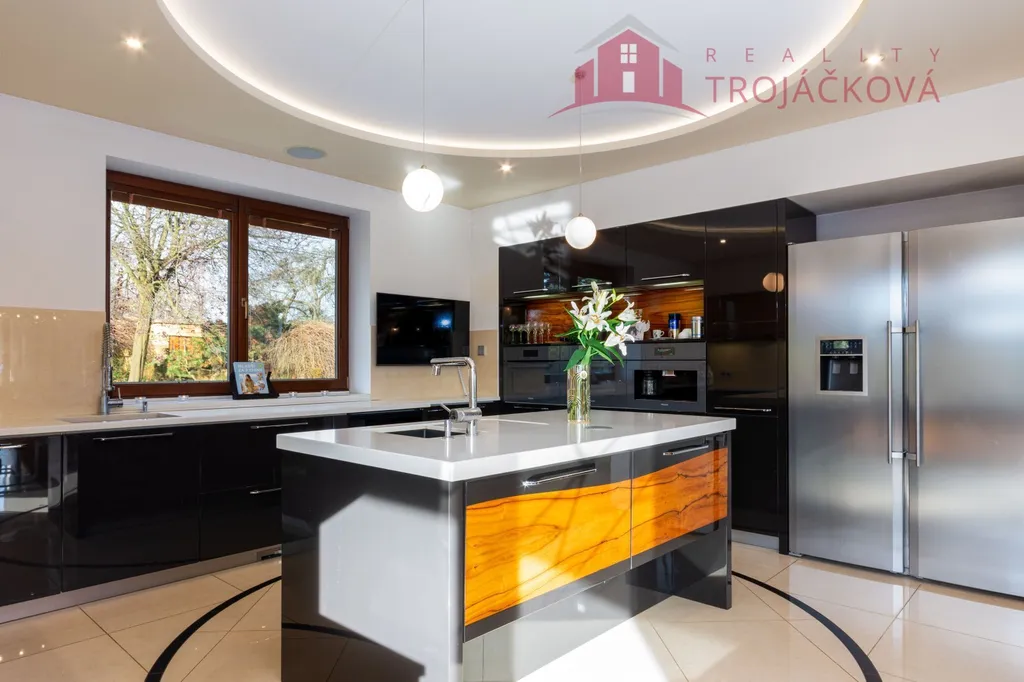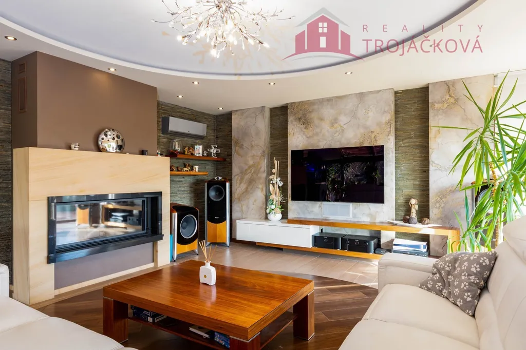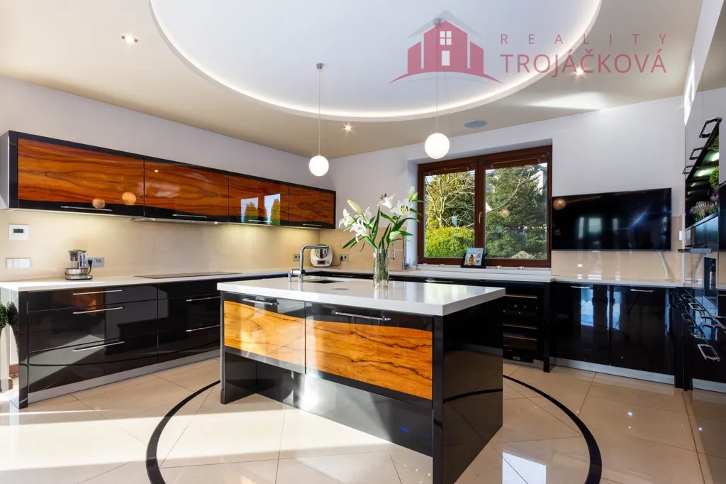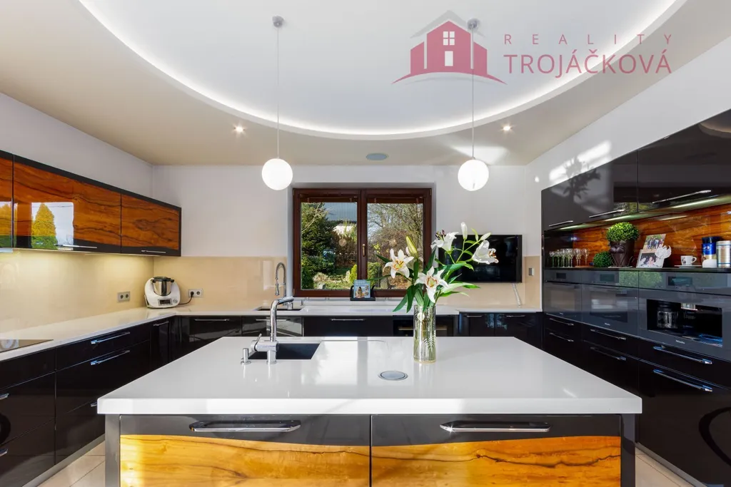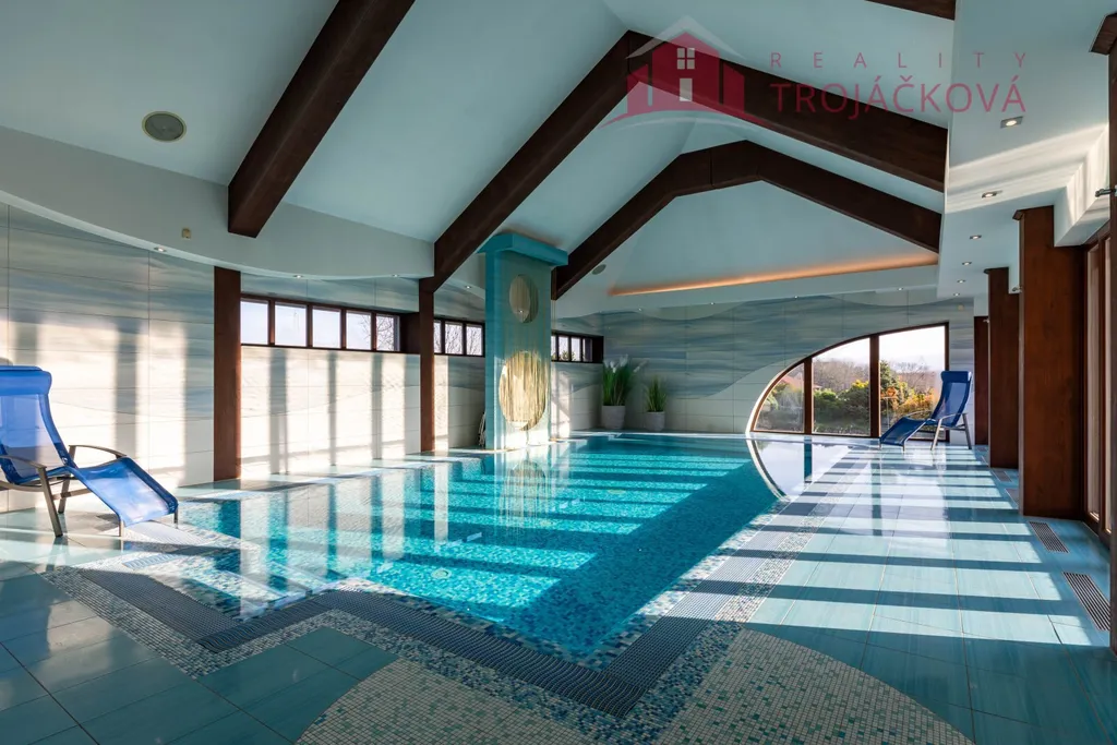 Přízemí se sestává z velkého obývacího pokoje propojeného s otevřenou jídelnou a kuchyní o ploše téměř 97 m2, kde se kombinuje moderní design s praktičností. Z obývací pokoje je vstup do zimní zahrady, je zde je krb a vestavěné mořské akvárium (800 l). Jídelna a obývací pokoj jsou vybaveny stropními designovými svítidly Swarovski. Na obývací pokoj navazuje moderní kuchyně vybavená kvalitními spotřebiči Miele, Liebherr a DeDietrich. Ze zádveří se vstupuje do technické místnosti a do haly a po obloukovém schodišti se z ní vychází do podkroví. Z haly je také vstup do pracovny, WC a ložnice. Na ložnici navazuje koupelna, která je průchozí a je z ní přístup do relaxační části objektu, kde se nachází vyhřívaný bazén s protiproudem (OXY systém) s vodní plochou 4x 8 m, finská sauna - vše s plně automatizovanou bazénovou technologií. Dále navazuje chodba s WC a sprchovým koutem. Z prostoru u bazénu je přímý vstup k vířivce a do zahrady. V podkroví se nacházejí tři pokoje, koupelna a WC. Součástí objektu je garáž se stáním pro 2 osobní automobily. Další dvougaráž je, jako samostatná stavba vedle domu spolu s hosp. budovou.