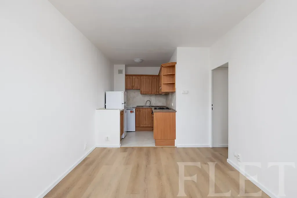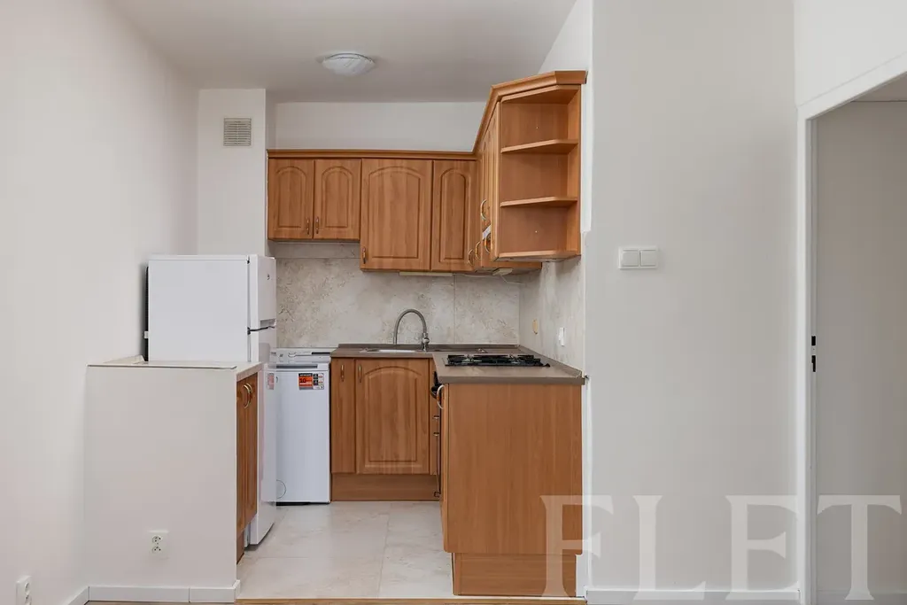 Součástí bytu je obývací pokoj s kuchyňským koutem, který je vybaven lednicí a sporákem. Z této místnosti je přímý vstup na balkón. V kuchyňské části je zároveň umístěna pračka. Koupelna je vybavena vanou a toaletou. K bytu náleží také sklepní kóje, která poskytuje další úložný prostor.