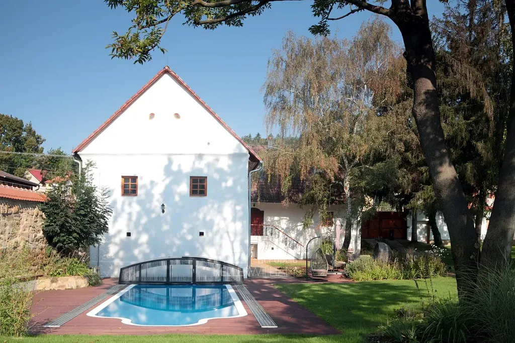 Stejně pečlivě jako interiér byla navržena i celá zahrada. Působí zcela přirozeně a volně navazuje na charakter okolní krajiny. Součástí zahrady je venkovní kuchyně, posezení s ohništěm, terasy i bazén umístěný na slunné části pozemku. Uzavřený dvůr poskytuje maximální soukromí a vytváří atmosféru klidného venkovského sídla, které působí elegantně, útulně a nadčasově.