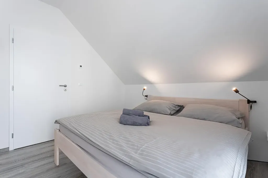 Apartmán nabízí příjemnou dispozici s centrální obytnou částí a dvěma ložnicemi po stranách. Je orientovaný na západ, velmi světlý a slunný. Pokoje jsou odhlučněné a extrémně tiché.