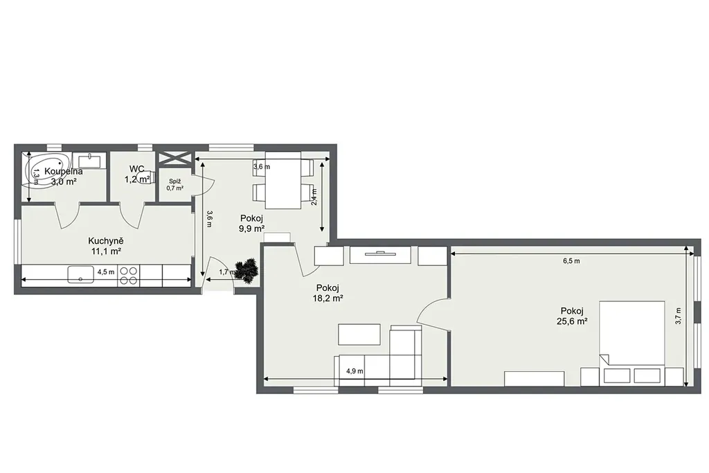 Dispozice bytu zahrnuje vstupní chodbu, samostatnou kuchyni, koupelnu, toaletu a technickou místnost s umístěním elektrokotle a bojleru. Dále jsou zde tři pokoje, přičemž dva z nich jsou vzájemně průchozí. Největší z pokojů má přes 25 m² a slouží jako hlavní obytný prostor. V jeho centrální části je dostatek místa pro jídelní kout. Další dva pokoje mohou sloužit jako ložnice, dětský pokoj, pracovna nebo pokoj pro hosty.