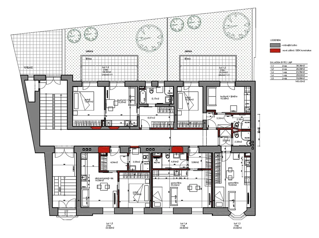 Zahrádka. Dům není chráněnoou památkou a je nyní připojen na elektřinu i funkční dálkové vytápění (teplárnou).