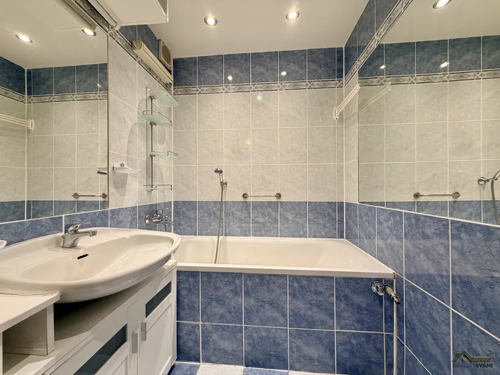 Bytové jádro je obloženo obklady, WC je samostatné a upravené. V celém bytě jsou vyměněny interiérové dveře. K dispozici jsou vestavěné skříně a prostorná šatna skrytá za zrcadlovou stěnou, která poskytuje dostatek úložného prostoru. Kuchyň je vybavena kuchyňskou linkou se sporákem a myčkou nádobí.
