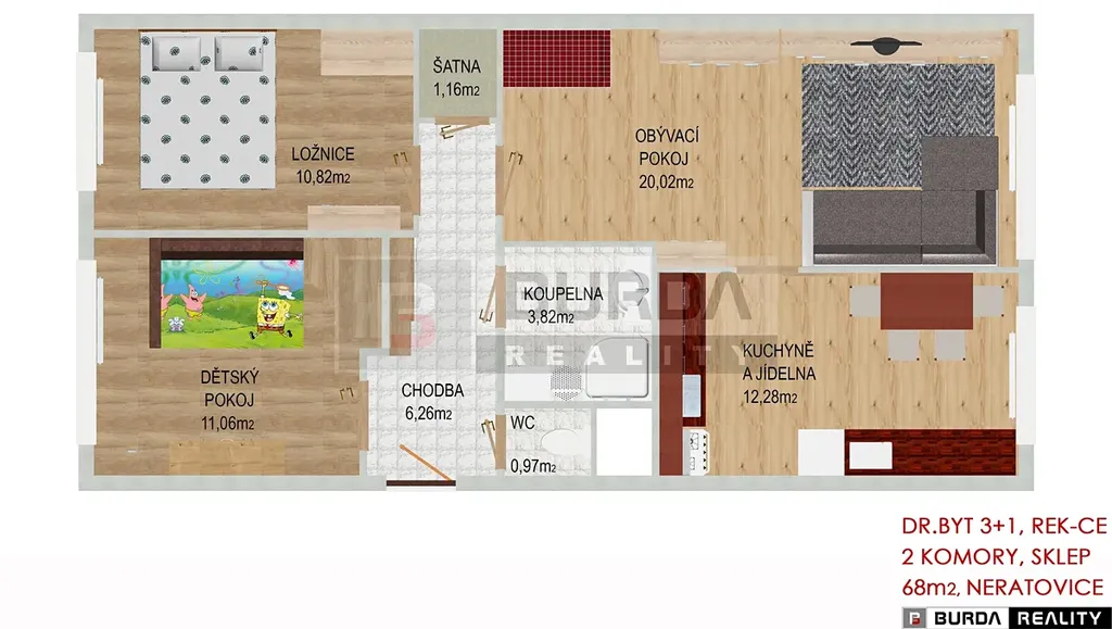 Celková plocha bytu je 68 m2. V bytě je vnitřní komora.