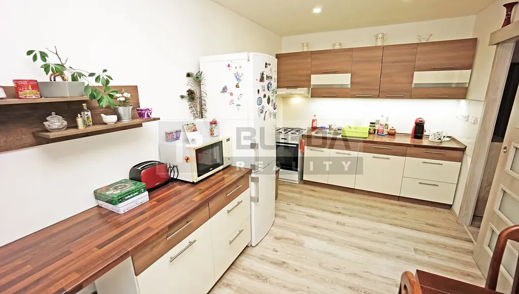 V kuchyni je kuch. linka, kombinovaný sporák Mora, digestoř Mora zaústěná do odtahu v šachtě, volně stojící lednice Whirpool (v případě zájmu může zůstat, stejně tak i stůl se židlemi).
