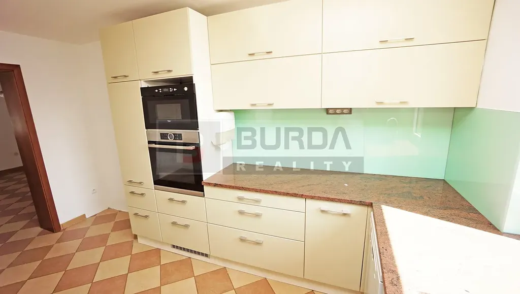 V kuchyni je kvalitní lakovaná kuchyňská linka na míru s žulovou deskou Multicolor, s nerezovým dřezem Franke s baterií. V lince je el. indukční deska Bosch, el. trouba Bosch, mikrovlnka Whirpool, volně vsazená myčka Miele (zůstane) a digestoř s odtahem. Obklad tvoří kombinace skla a lacobelu.