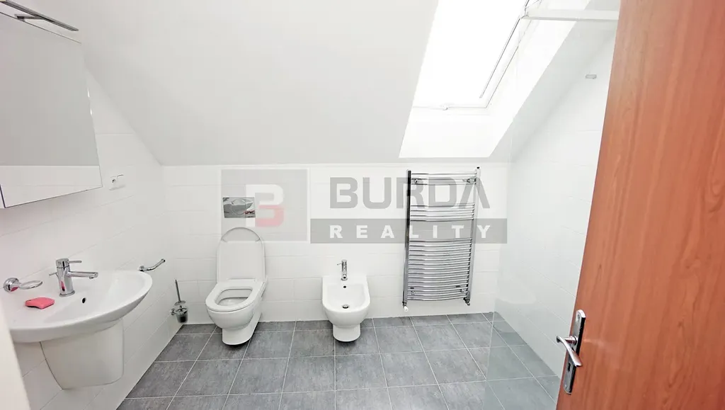 V koupelně v 2NP je sprchový kout, umyvadlo s baterií Jika, WC, bidet zn. Jika, vestavěná skříň a topný žebřík.
