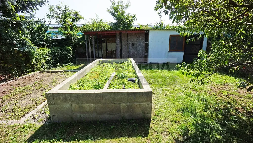 Vzadu na zahradě je zděná kůlna na nářadí s navazujícím dřevníkem, před níž je vyvýšený záhon.