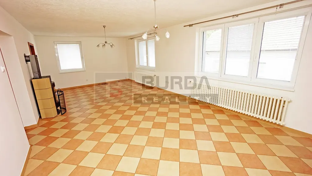 1.NP = zvýšené přízemí: zádveří, obývací pokoj s krbovými kamny Romotop, kuchyně, koupelna s WC.