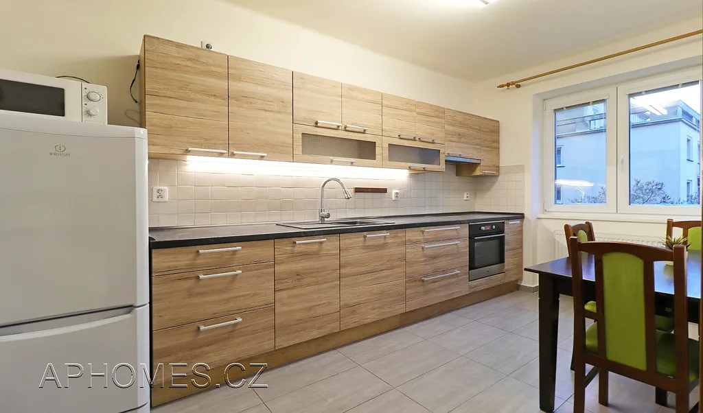 Součástí vybavení bytu je kvalitní kuchyňská linka (vestavěná trouba, sklokeramická varná deska, digestoř, myčka nádobí, lednice, mikrovlnná trouba).