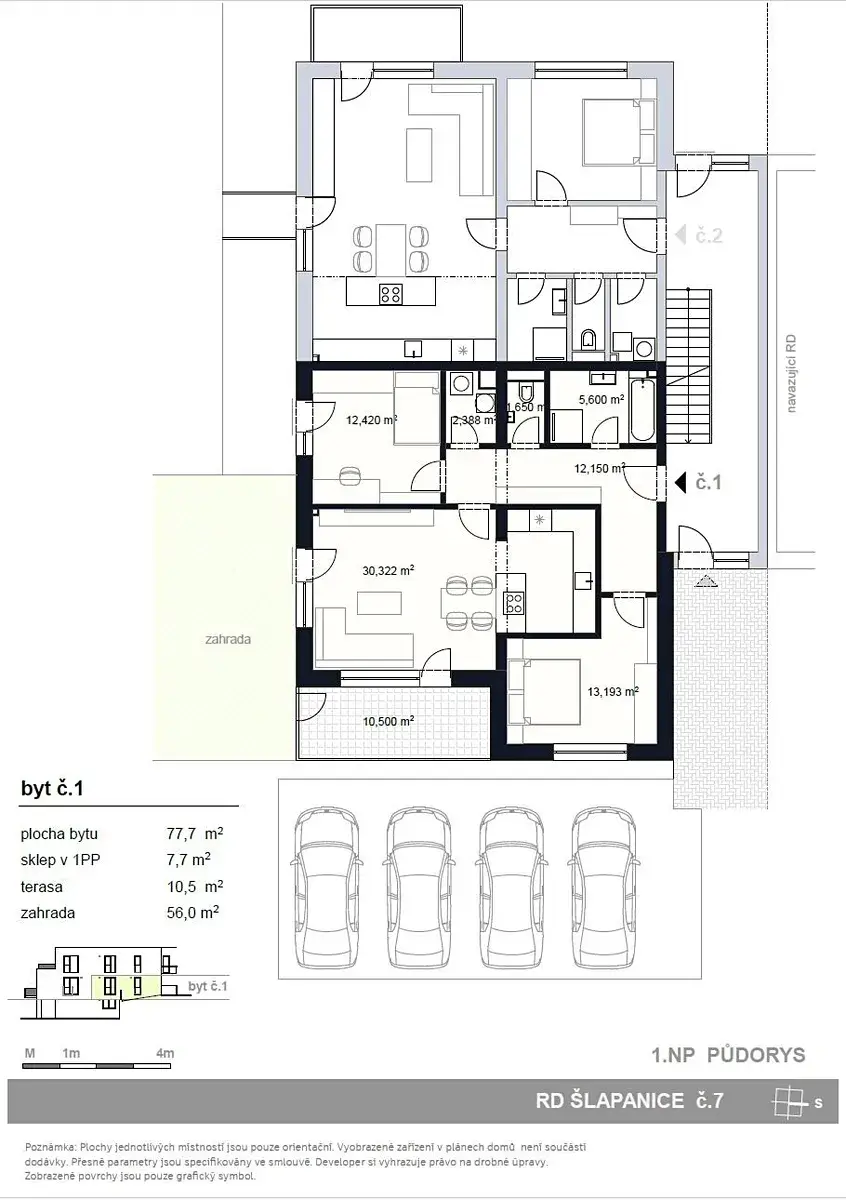 Dispozice: chodba 12,42m2, obývací pokoj s kuchyňským koutem 30,3m2 s přímým vstupem na terasu 10,5m2 a zahradu 56m2, ložnice 13,19m2, dětský pokoj 12,42m2 se vstupem na balkon, koupelna s vanou a sprchovým koutem 5,6m2, WC zvlášť 1,65m2. a technickou místností 2,38m2.