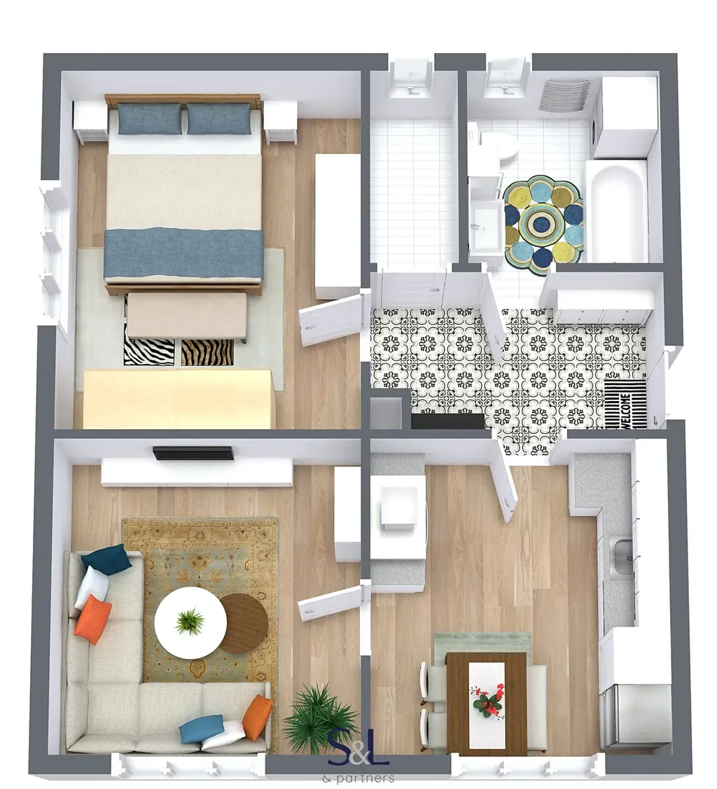 Dispozici tvoří vstupní chodba, zděná koupelna s vanou a toaletou, kumbál, ložnice, průchozí kuchyně a pokoj.