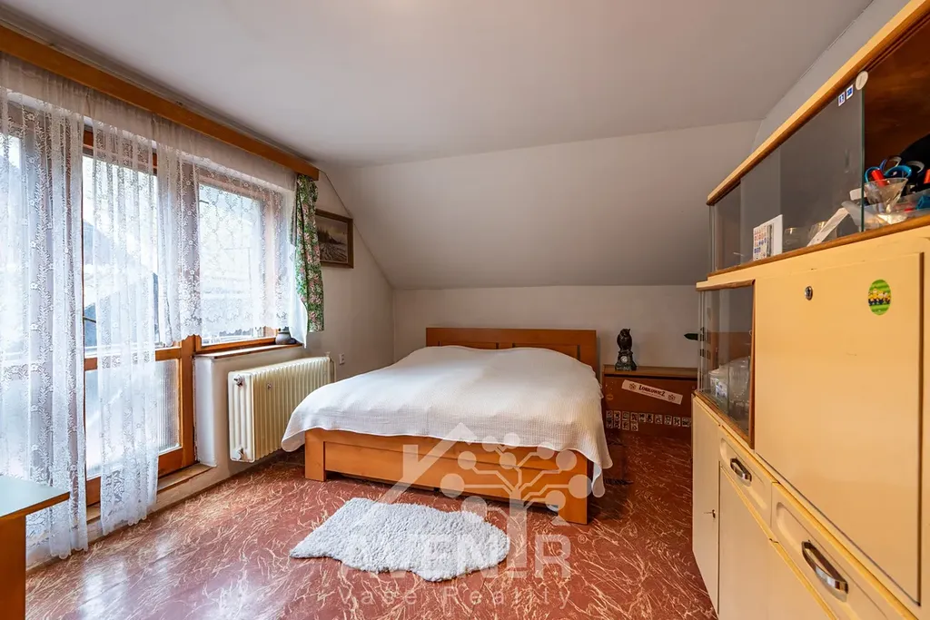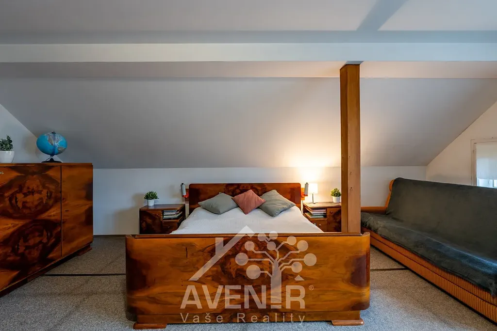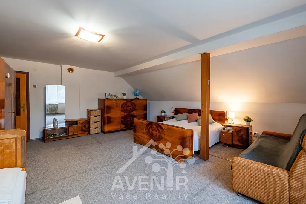 Podkroví domu nabízí ložnici s balkónem, prostorný obývací pokoj, samostatnou toaletu a koupelnu, kuchyň, druhou ložnici, chodba, a další prostor na využití podle potřeby.