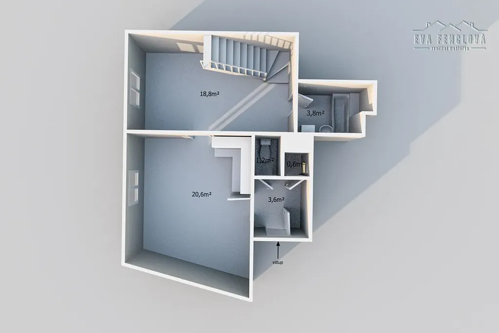 Z obývacího pokoje pak po dřevěných schodech vystoupáte do druhého podlaží, kde naleznete velkou ložnici s možností rozdělení na 2 pokoje.