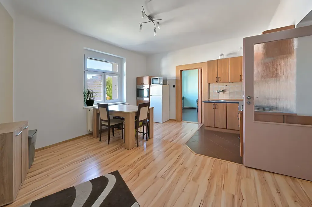 Byt o podlahové ploše 74m² je situován do dvou podlaží, kde v prvním podlaží naleznete předsíň, samostatné WC, spižírnu, kuchyň průchozí do obývacího pokoje a koupelnu.