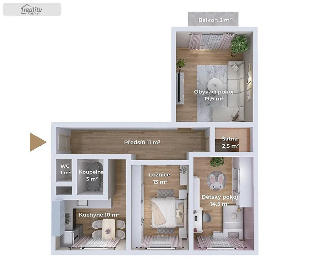 Dispozice bytu je flexibilní – díky příčce je možné upravit uspořádání podle vlastních potřeb.