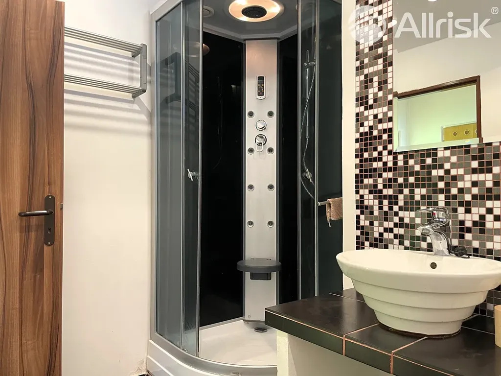 Velká zděná koupelna nabízí nadstandardní sprchový kout se sedátkem a dostatek prostoru pro pračku i sušičku – vše přehledné, pohodlné a světlé.